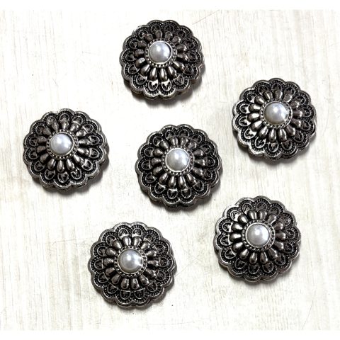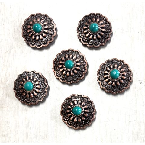 Add a touch of Western elegance to your saddle or leather projects with this premium 6-pack of decorative conchos. Each 2-inch concho features an intricately detailed swirl pattern centerpiece surrounded by alternating copper-toned beads and amber-colored crystal accents. The antique silver finish gives these conchos a classic, timeless appeal that perfectly complements Western-style leather goods. Made from durable stainless steel, these conchos come complete with matching screws for secure attachment.
