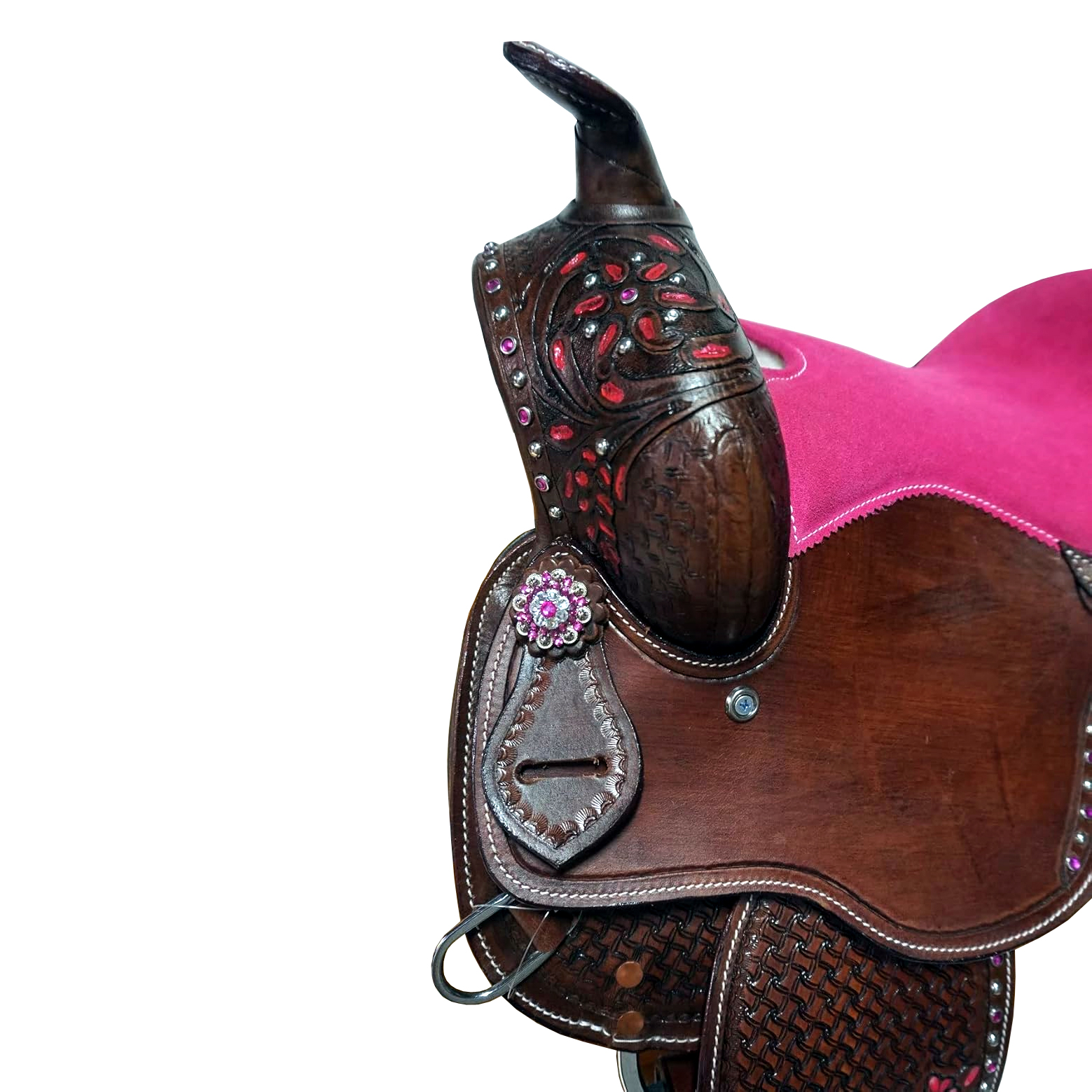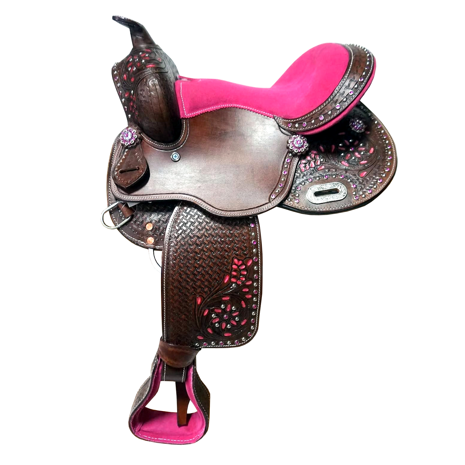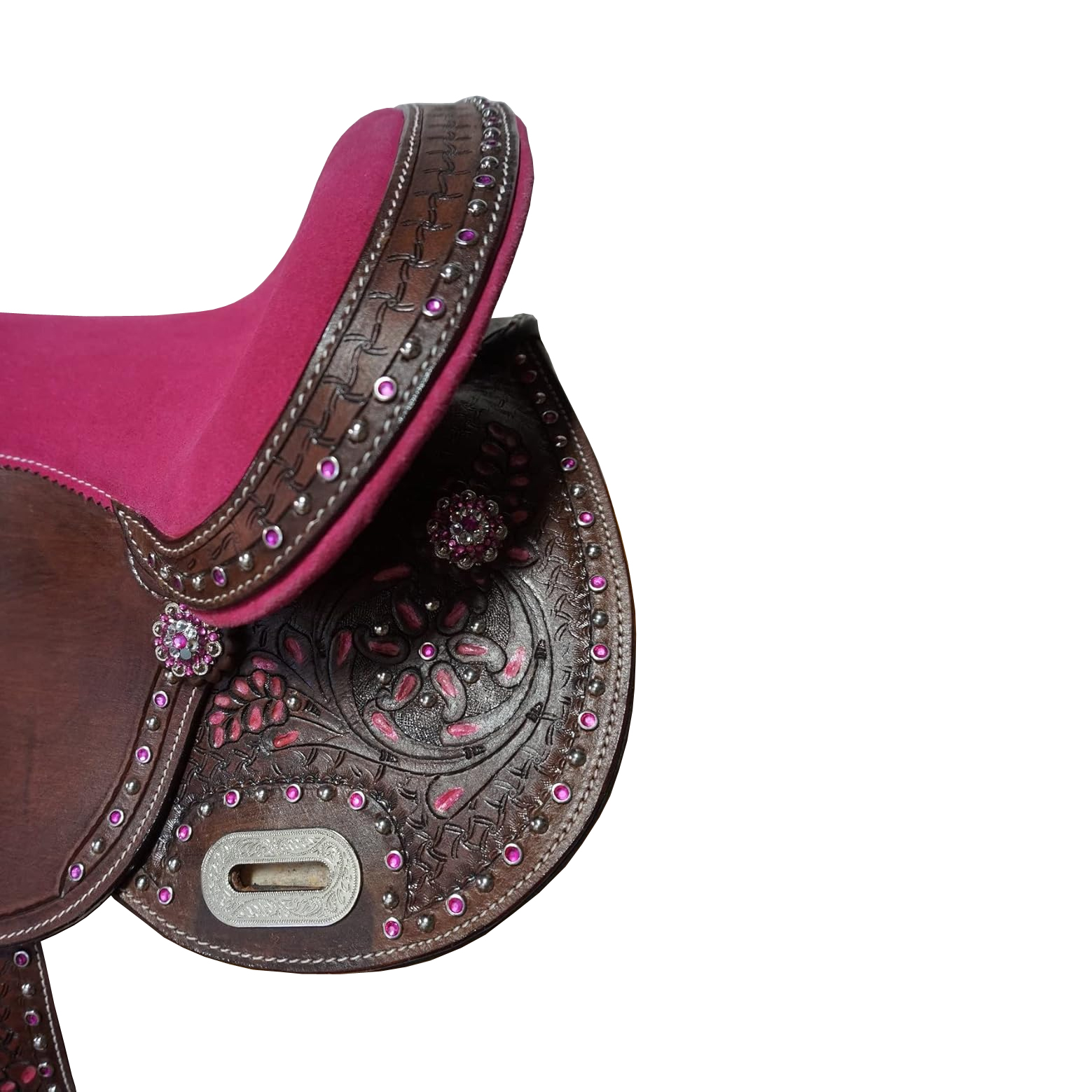 The hand-tooled floral and leaf designs are accented by a silver dot edge and padded fancy-stitched suede seat.