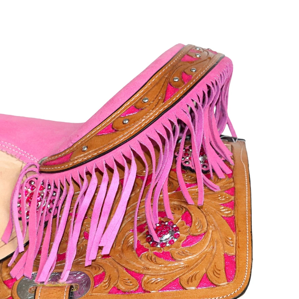This beautiful classic western saddle is perfect for out on the trails or working the ranch! It is time to ride this beautiful western saddle . This saddle is perfect choice to attract attention . Wood and fiberglass tree is light weight and well made to ensure the strength. The underside is well-padded with a synthetic fleece to ensure your horse stays comfortable throughout the ride. Nylon reinforcement on leather stirrup for extra safety. This saddle has a sued seat with a variety of colors and pretty Conchos, your little one will be ready for adventure!