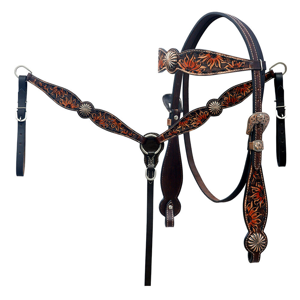 Western Horse Headstall Breast Collar Set Genuine Leather Floral Tooled Handmade