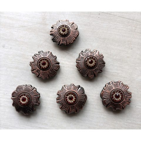 Add a touch of Western elegance to your saddle or leather projects with this premium 6-pack of decorative conchos. Each 2-inch concho features an intricately detailed swirl pattern centerpiece surrounded by alternating copper-toned beads and amber-colored crystal accents. The antique silver finish gives these conchos a classic, timeless appeal that perfectly complements Western-style leather goods. Made from durable stainless steel, these conchos come complete with matching screws for secure attachment.